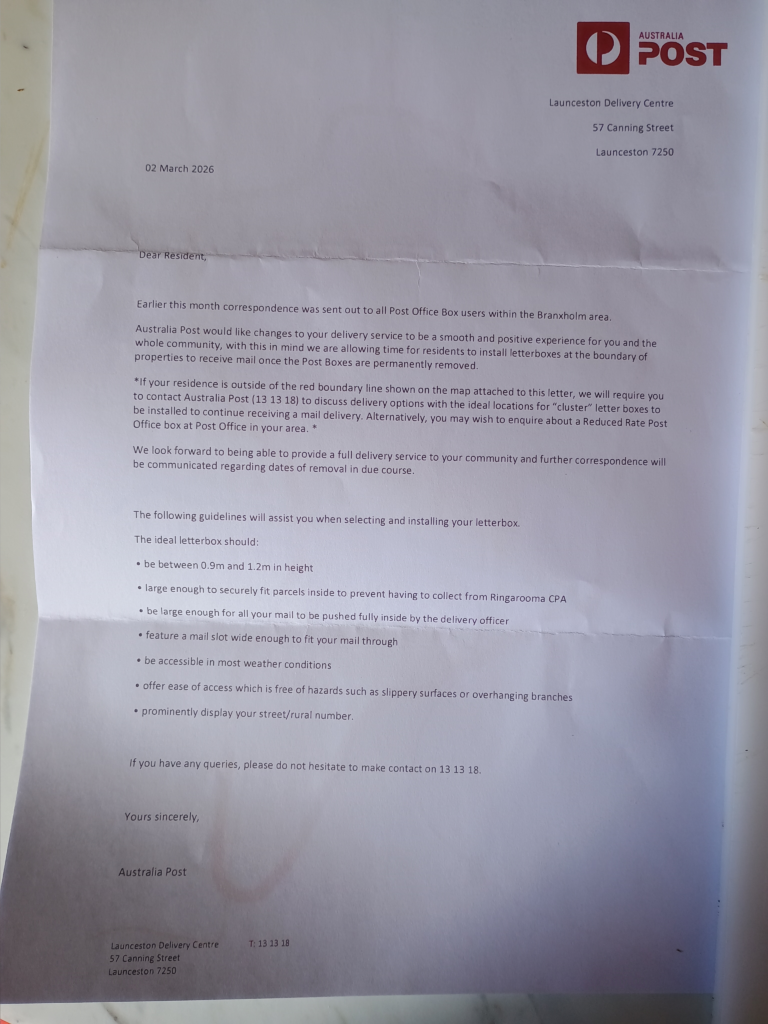 Presumably the unidentified alleged representative of the Launceston Delivery Centre is referring to their 11 February letter that was not “. . . sent out to all postal box users . . .” unless you consider the “. . . Branxholm area” to be the parts of Branxholm that deliveries are made to, rather than the Branxholm delivery area which includes all the properties serviced by the postal boxes.