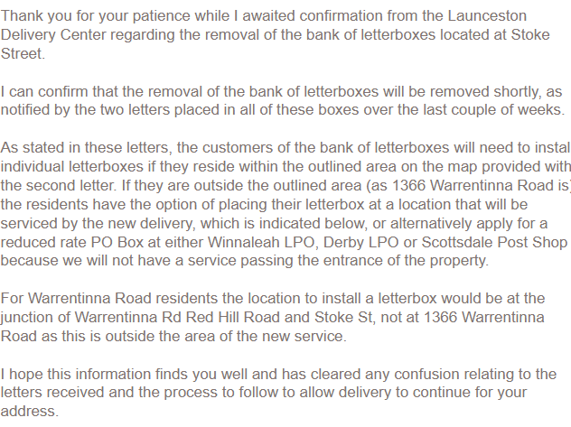 The upshot of the conversation was a new interpretation: 1366 Warrentinna is only in the delivery area because of the existence of the postal boxes that the manager was unaware existed despite all the correspondence. She undertook to get to the bottom of matters with the Launceston Delivery Centre.