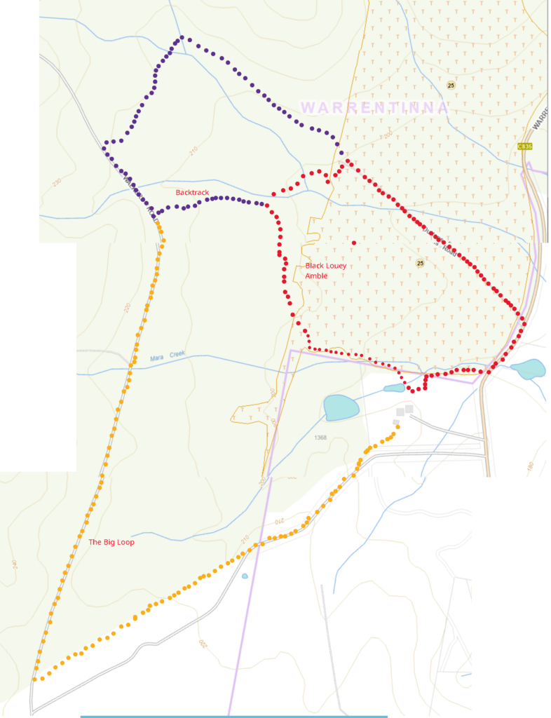 Start at the creek crossing in the Gardens and walk up towards the big gum tree. Black Louey is rumoured to have ambled along this path on his last day. The path is marked with pink ribbons. It meanders through native forest and pine plantation to Duttons Road. Turn right at Duttons Road and proceed down through the native rain forest to Warrentinna Road. Turn right. After Warrentinna Road crosses Mara Creek there is a path that cuts through back to the Gardens.
